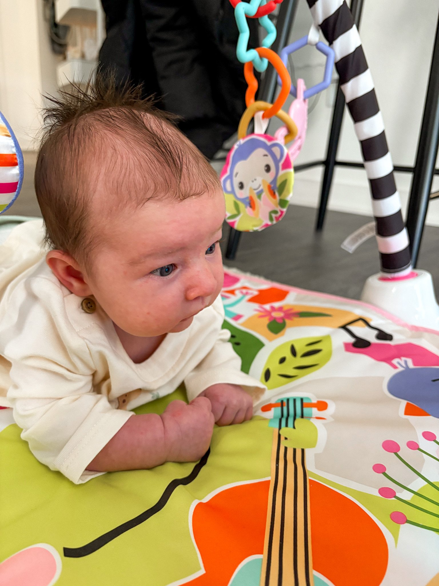 It also includes a mirror and crinkly toy, and I love that the piano can be used to prop contrast cards when we want a lower-stimulation tummy time session. This is another item that grows with your baby well into toddlerhood.